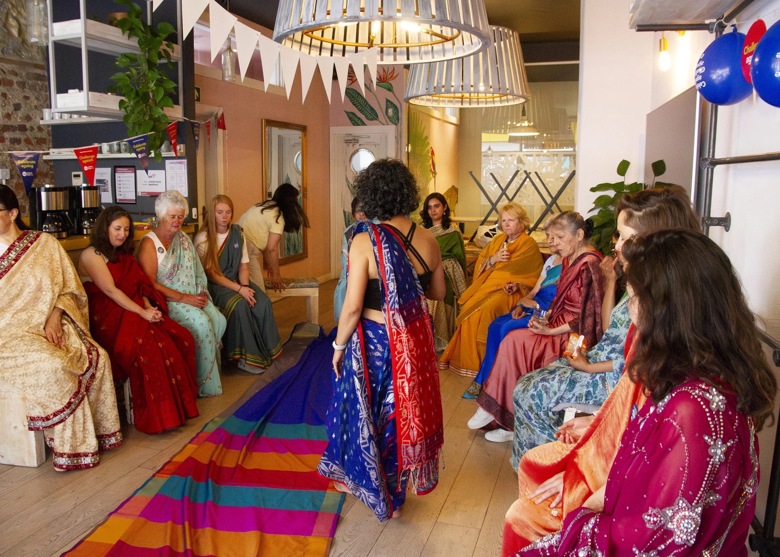 The Funshop took place at the JustLife Hub in Brighton. 12 people gathered, alongside instructors, for an afternoon of dress up and joy. As the attendees arrived, they were immediately captivated by the colourful array of sarees we had on display. They were invited to choose a saree they wanted to wear and were draped up in the nivi drape by the instructor.